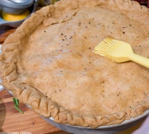 Mix the vegetables together and place in bottom of pie crust. Combine oil, water, tamari, nutritional yeast and pour over vegetables then put top crust on.