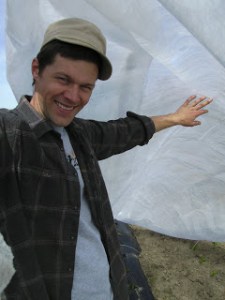 Ben holding up a row cover (veggie blanket)…