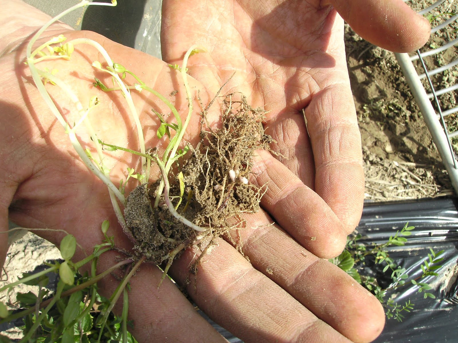 Seen here, common vetch (the plant) and mycorrhiza (white nodes on the tiny roots), symbiotically related. Vetch supplies nutrients to the mycorrhizae which fixes nitrogen from atmospheric nitrogen which in turn is released into the soil when the plant dies and decomposes. A positive feedback cycle…