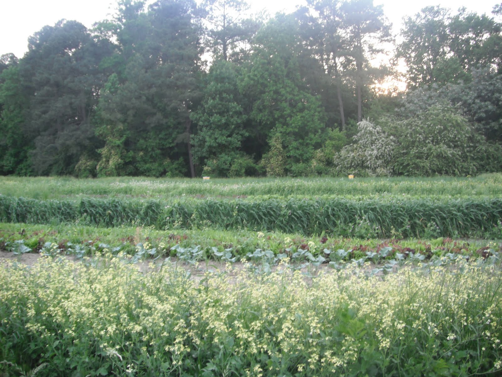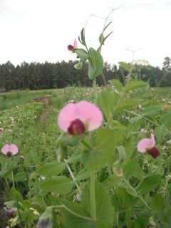 Here’s a shot of one of the sections. Most of what you can see is peas and oats (and the yellow stuff, well, that’s wild radish – we don’t care for it much but the bees and the chickens sure do!).