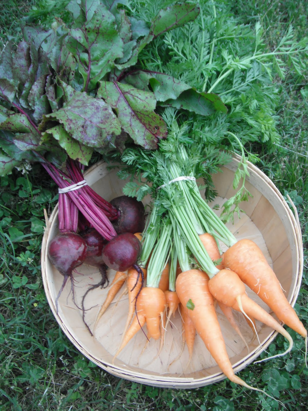 Here are some beautiful root vegetables (beets, carrots and Hakurei turnips and greens) with strawberries.