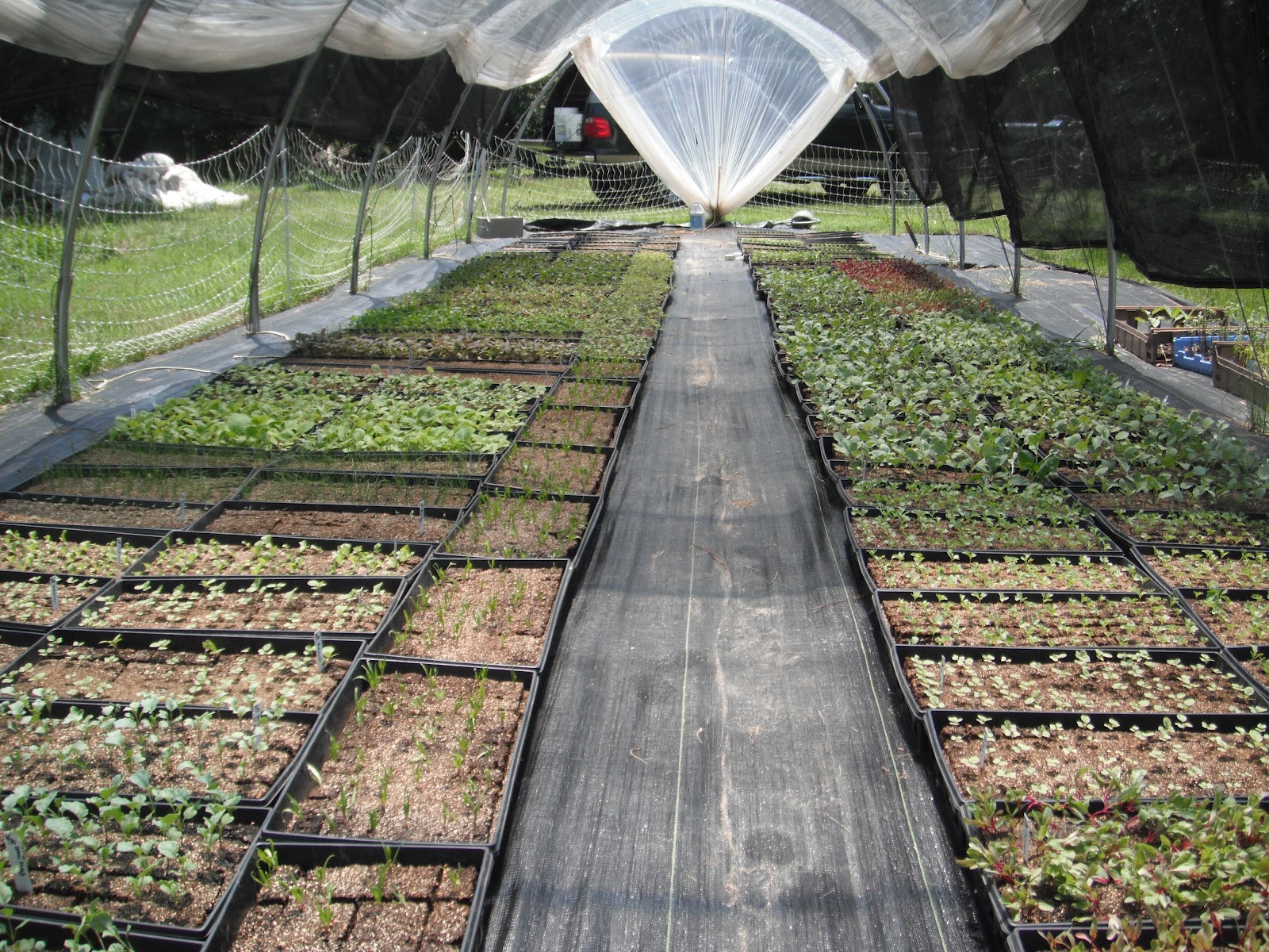 | Seedlings in the tunnel (thanks to Cate, Allie & Brandi for helping us seed these flats!) |